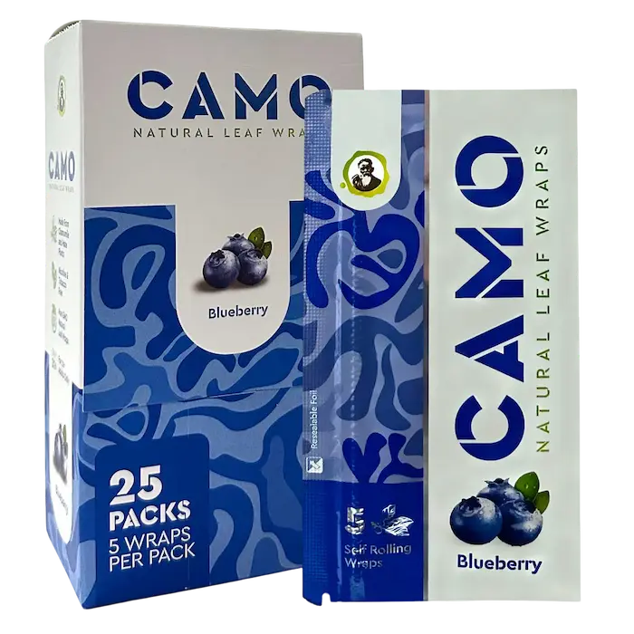 Introducing Camo Natural Leaf Wraps, crafted in Brazil from 100% natural chamomile and mate plants. Enjoy the slow burn and convenience of Camo Natural Leaf Wraps, perfect for self-rolling enthusiasts. These wraps are nicotine and tobacco-free, making them ideal for use with your favorite herbal blend. Each pack contains 5 wraps, and with 25 resealable foil packs per box, you’ll always have a fresh supply on hand.