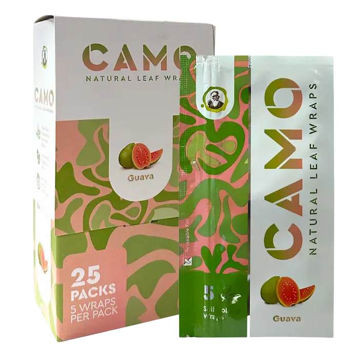 Introducing Camo Natural Leaf Wraps, crafted in Brazil from 100% natural chamomile and mate plants.These wraps are nicotine and tobacco-free, making them ideal for use with your favorite herbal blend. Each pack contains 5 wraps, and with 25 resealable foil packs per box, you’ll always have a fresh supply on hand.