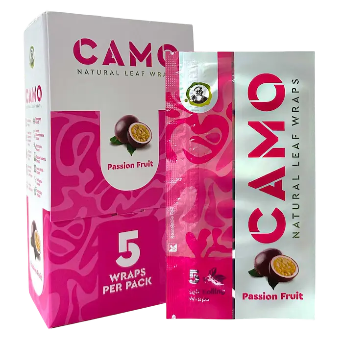 Introducing Camo Natural Leaf Wraps, crafted in Brazil from 100% natural chamomile and mate plants.These wraps are nicotine and tobacco-free, making them ideal for use with your favorite herbal blend. Each pack contains 5 wraps, and with 25 resealable foil packs per box, you’ll always have a fresh supply on hand.