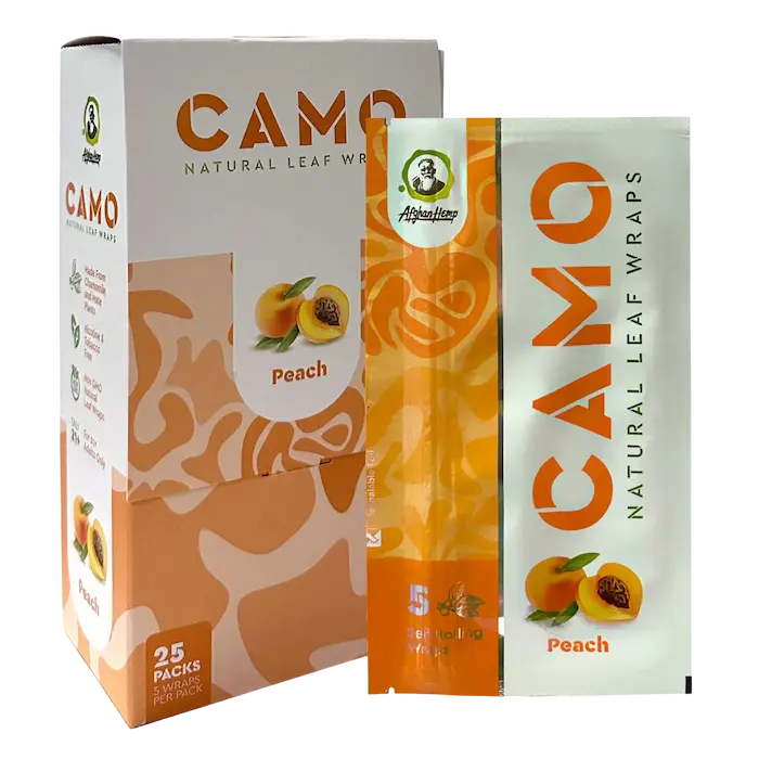 Introducing Camo Natural Leaf Wraps, crafted in Brazil from 100% natural chamomile and mate plants.These wraps are nicotine and tobacco-free, making them ideal for use with your favorite herbal blend. Each pack contains 5 wraps, and with 25 resealable foil packs per box, you’ll always have a fresh supply on hand.