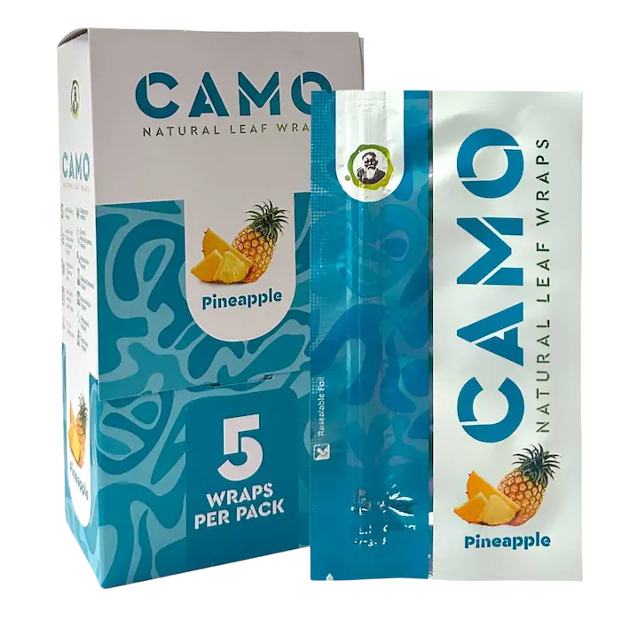 Introducing Camo Natural Leaf Wraps, crafted in Brazil from 100% natural chamomile and mate plants.These wraps are nicotine and tobacco-free, making them ideal for use with your favorite herbal blend. Each pack contains 5 wraps, and with 25 resealable foil packs per box, you’ll always have a fresh supply on hand.