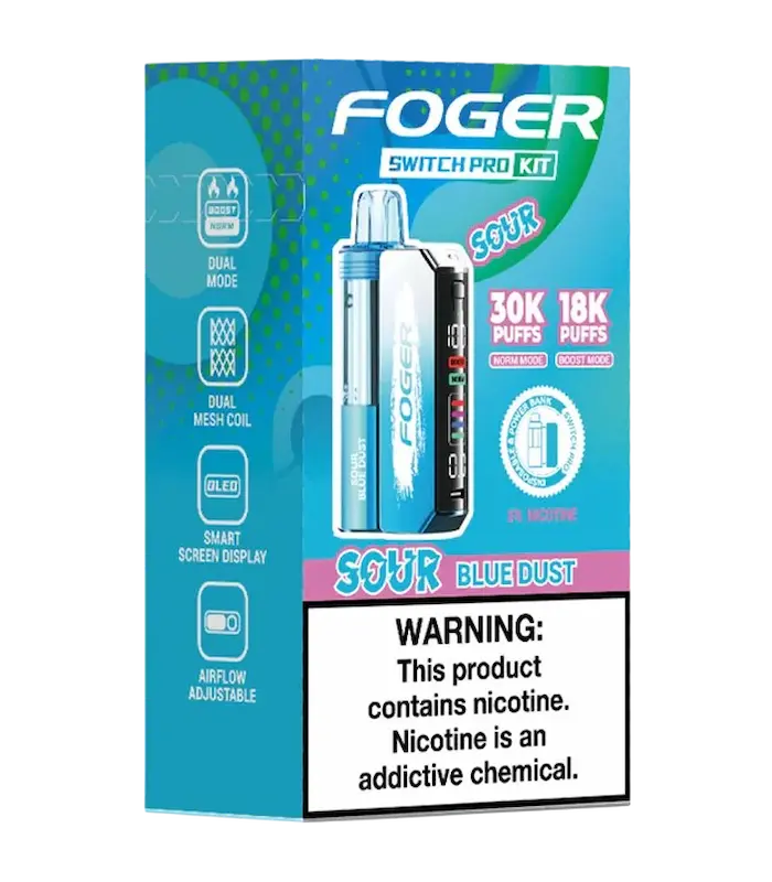 The Sour Blue Dust Foger Switch Pro Kit contains both the disposable half which is loaded with 19ml of delicious e-liquid and the reusable power bank, which powers this 30K puff disposable.