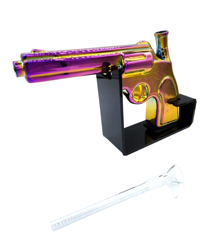 This cool water pipe looks like a Magnum Revolver but is made to be used for peaceful purposes. It’s made from ceramic and comes with a stand flat bottom base and glass downtube.