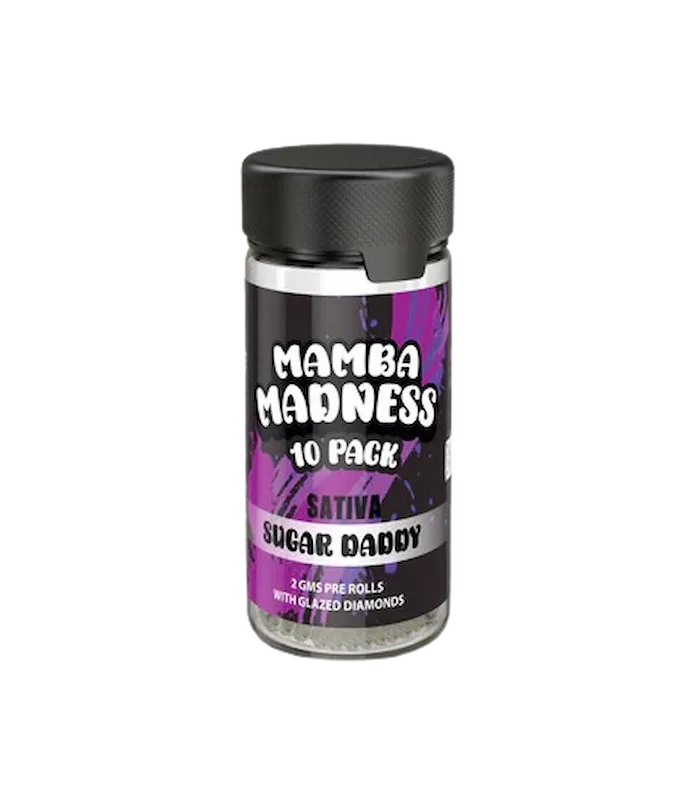 Mamba Madness 10-Pack Jar – each pre-roll loaded with 2 grams of fire and glazed with diamonds for a next-level experience. Perfectly packed and conveniently jarred, this collection delivers smooth hits, bold effects, and a luxe finish.